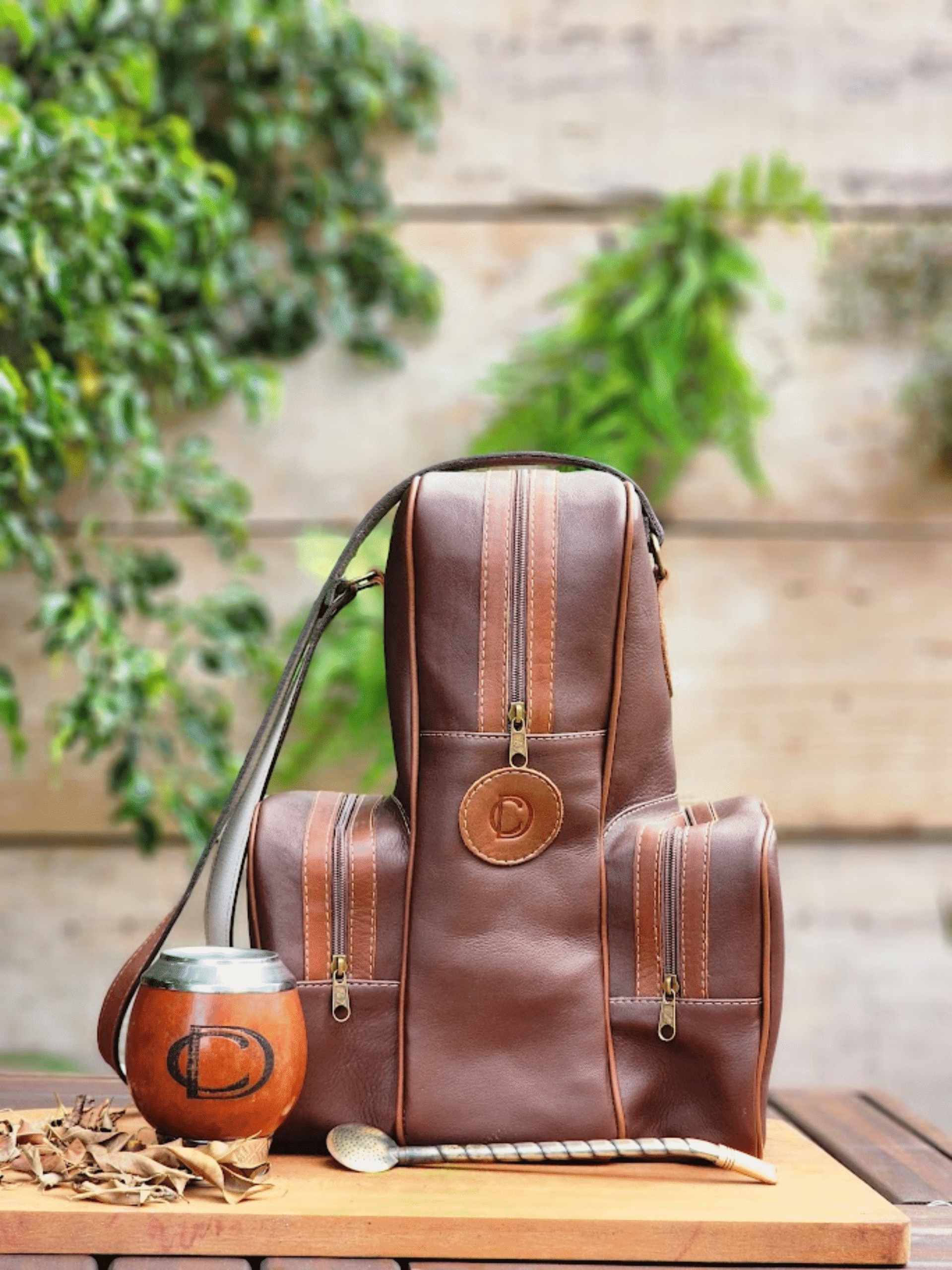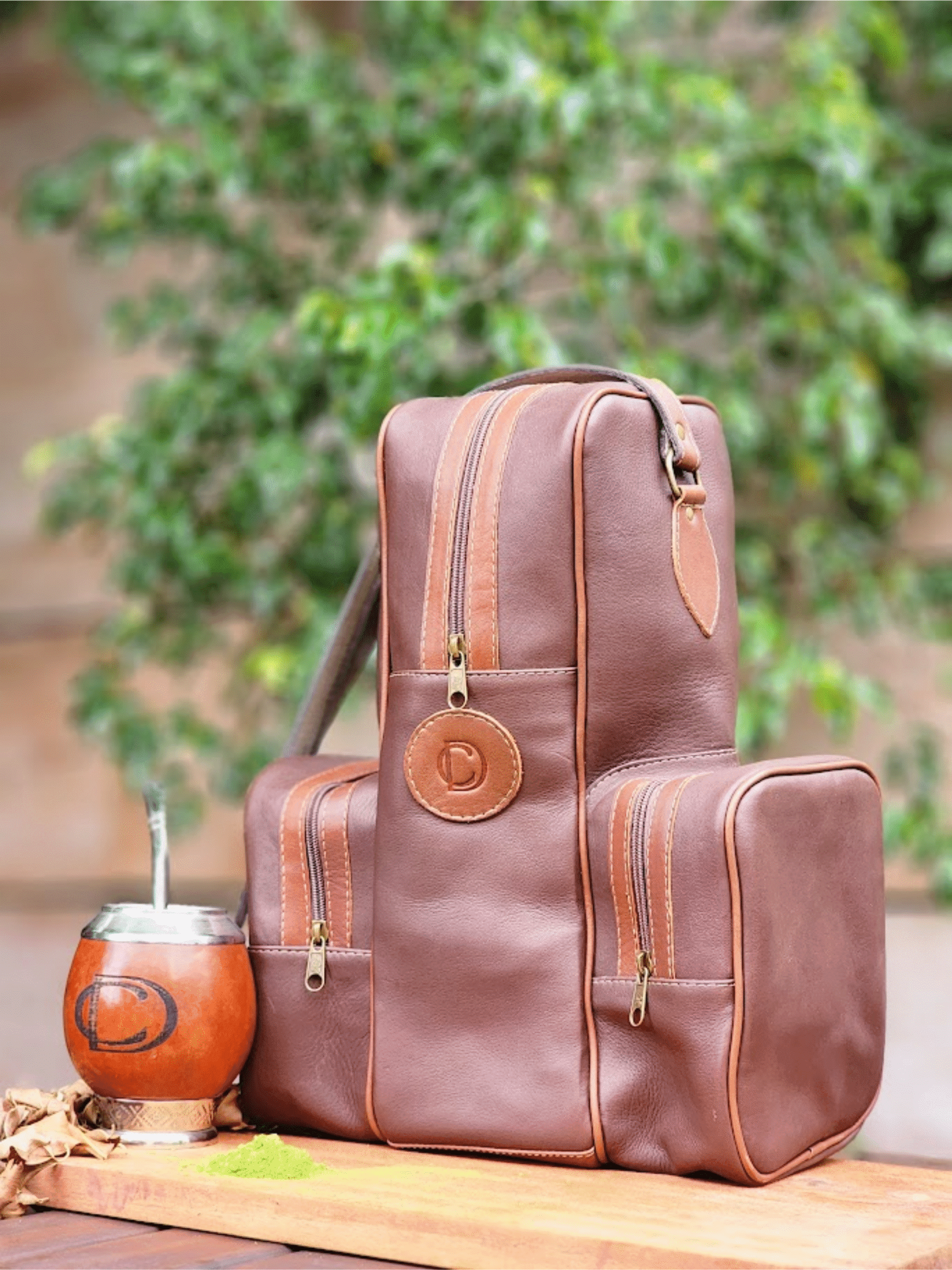 Mateira fechada de couro genuino DC, com detalhes em caramelo.